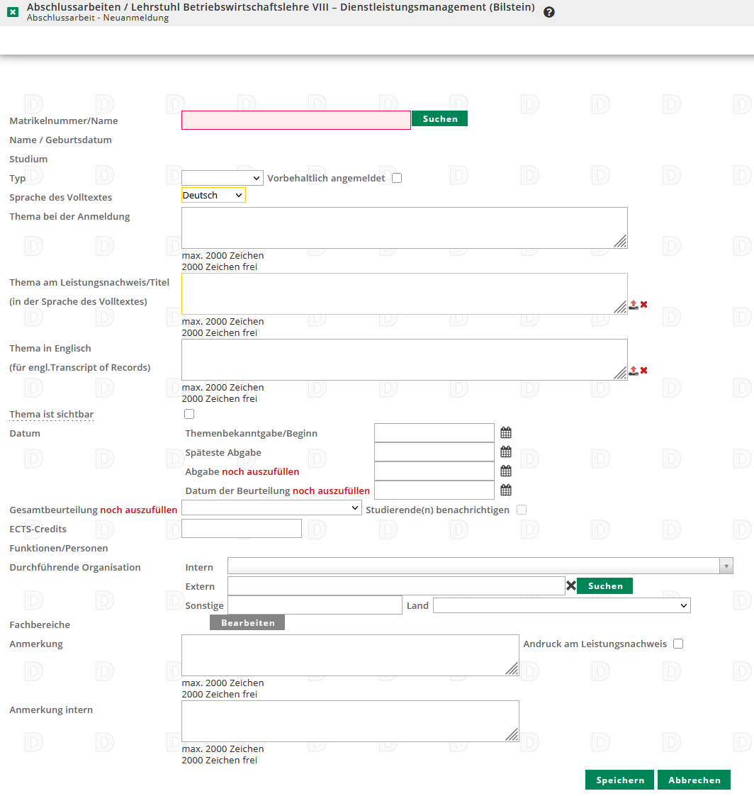 Im Anschluss können Sie den Typ der Abschlussarbeit eintragen und die Sprache der Arbeit auswählen. Darunter können Sie den Titel der Arbeit einfügen. Bei Themenbekanntgabe/Beginn müssen Sie das Anmeldedatum eintragen. Die späteste Abgabe der Arbeit lassen Sie bitte leer. Die Abgabefrist wird vom Prüfungsamt überprüft, sobald Sie die Arbeit eingetragen haben, und hinzugefügt.