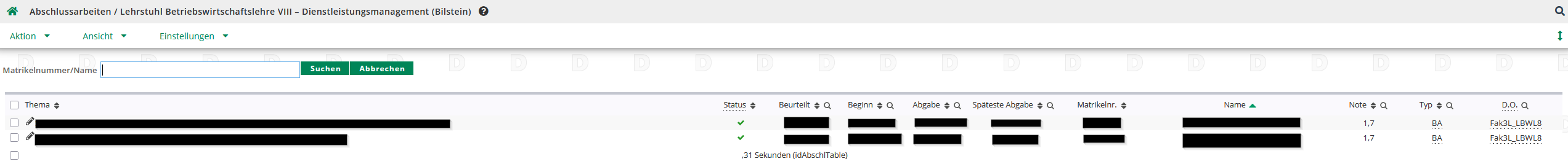 Im Menübereich oben können Sie im Reiter Ansicht auswählen, nach welchen Kriterien die Abschlussarbeiten in der Liste angezeigt werden sollen.