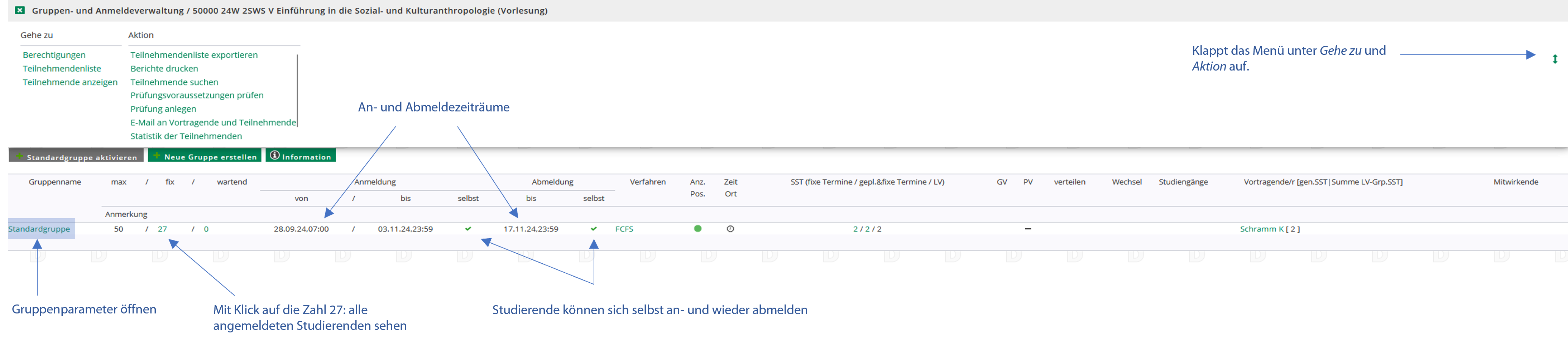 Beim Öffnen der Gruppen- und Anmeldeverwaltung zu einer konkreten Veranstaltung in der Lehrerhebung können Sie genau erkennen, wie viele Studierende sich für welche Gruppe angemeldet haben, ob Studierende sich zur Veranstaltung anmelden können, ob eine Selbstanmeldung durch Studierende erlaubt ist, ob Studierende auf der Warteliste sind und wer sich für die Veranstaltung angemeldet hat: