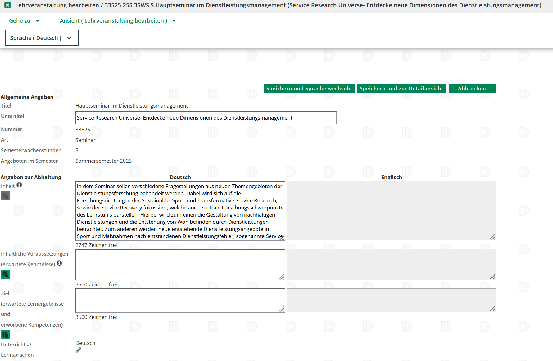 Mit Klick auf Speichern und Sprache wechseln können Sie die Informationen auch noch einmal auf Englisch hinterlegen. Bitte geben Sie immer den fremdsprachigen Titel der Lehrveranstaltung an, da er für die englische Version des Transcripts of Records der Studierenden benutzt wird.