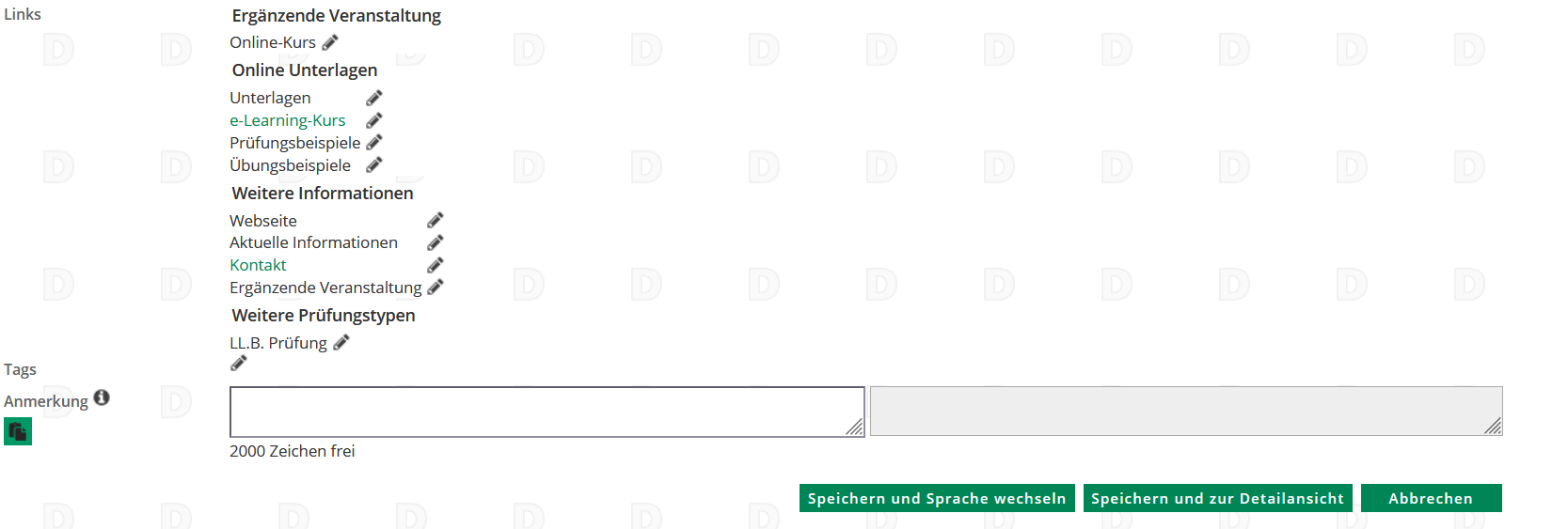 In dieser Ansicht wird auch der Link zum entsprechenden Kurs auf e-Learning hinterlegt. Es empfiehlt sich, hier auch die korrekte(n) Unterrichtssprache(n) anzugeben. (Bei Angabe mehrerer Unterrichtssprachen muss eine als Hauptsprache ausgewählt werden.)