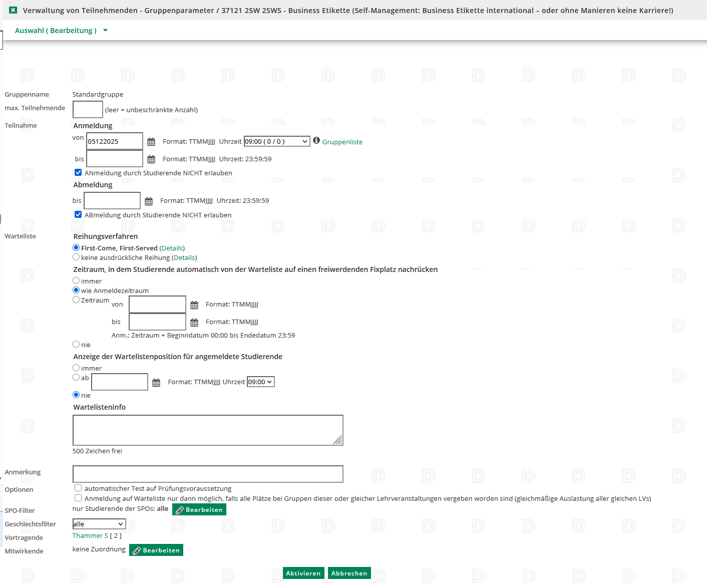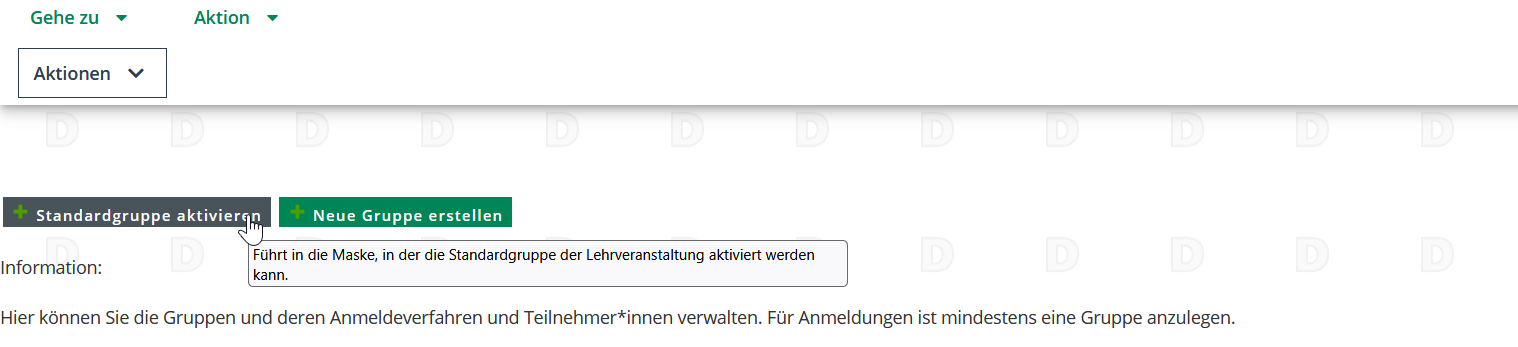 0/0/0 Die Standardgruppe ist nicht aktiviert. Die Studierenden können sich nicht zur Veranstaltung anmelden.