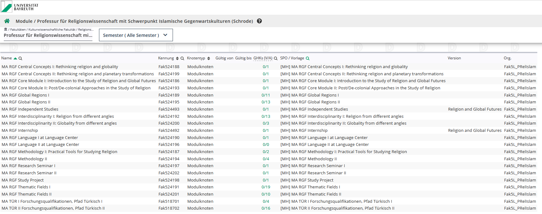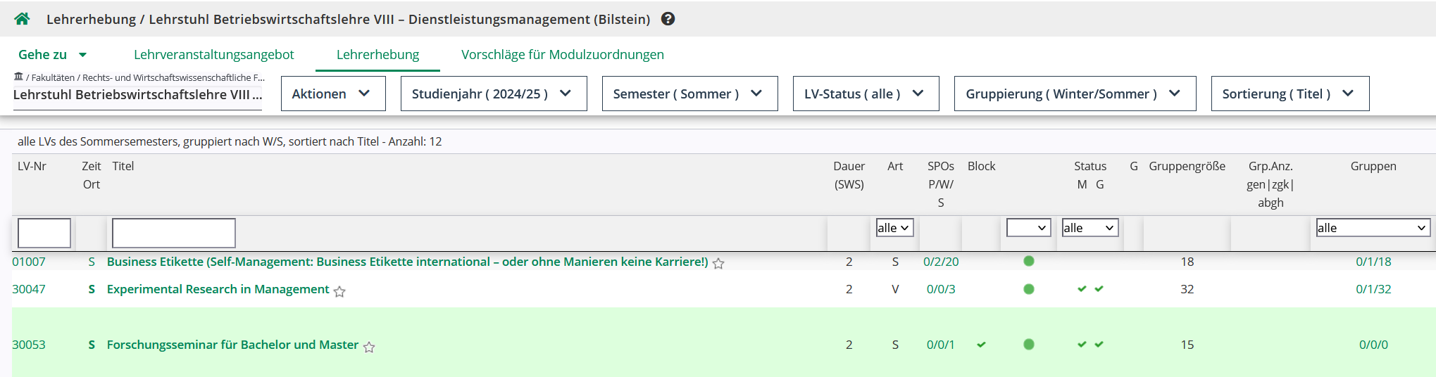 Um zu sehen, mit welchen Modulen eine Lehrveranstaltung verknüpft ist, können Sie in der Lehrerhebung (oder im Lehrangebot) in der Spalte SPOs P/W/S nachsehen.