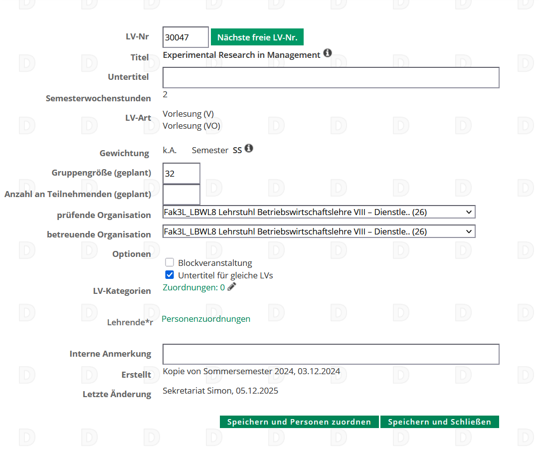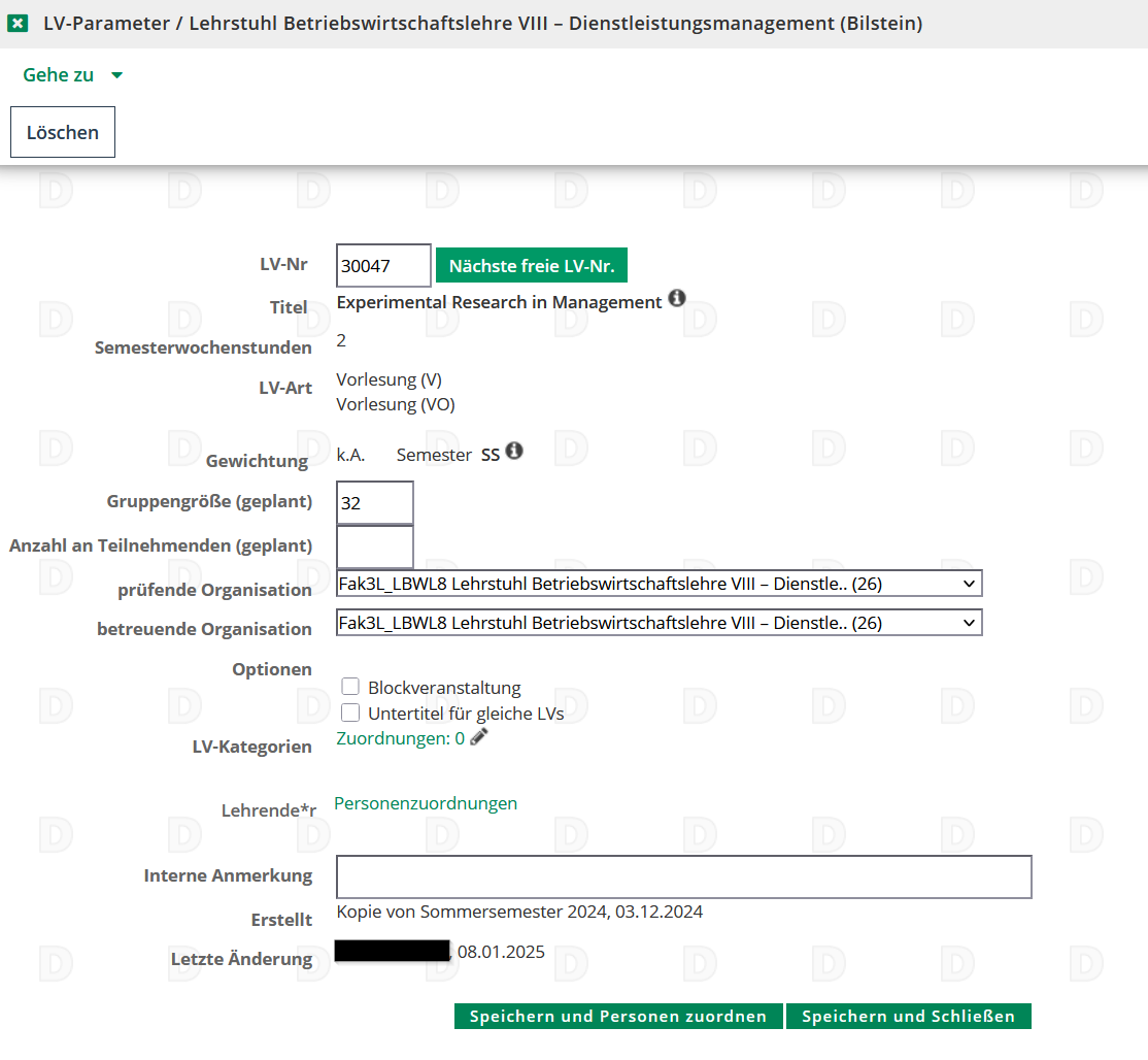 LV-Parameter bearbeiten – Bestehende Lehrveranstaltungen