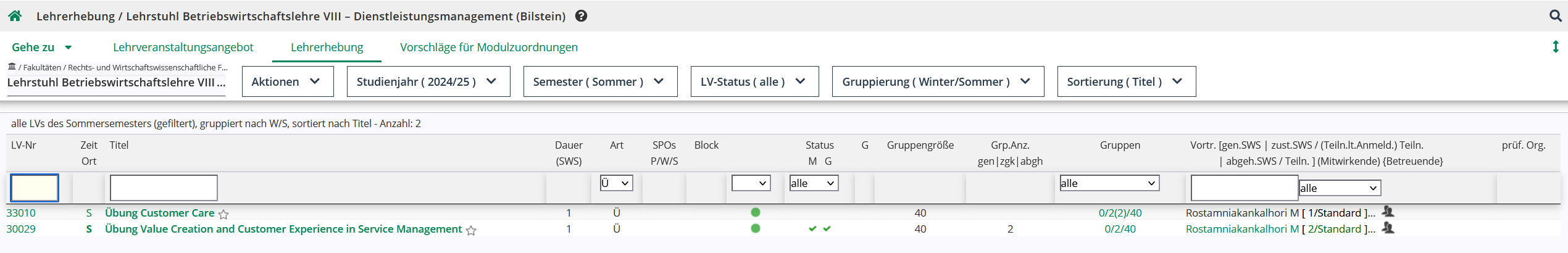 Nachdem Sie die betreuende Organisation geändert haben und die LV-Parameter speichern, erscheint die LV nur bei der Ziel-Organisation in der Lehrerhebung. Nur wenn Sie auch dort entsprechende Rechte haben, können Sie die LV weiter (über die neue Organisation) bearbeiten.