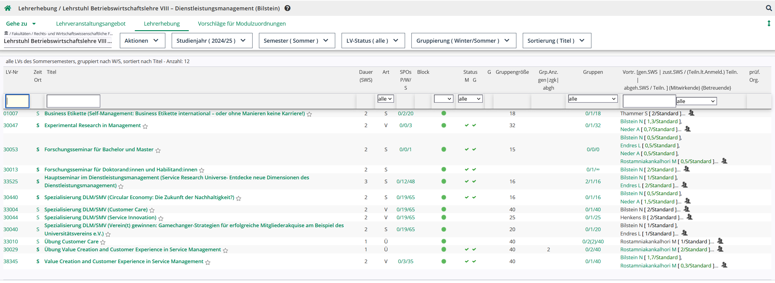 Hier können Sie – anders als in der Applikation Lehrangebot – die angezeigten Lehrveranstaltungen bearbeiten, melden und genehmigen, sowie Dozierende zuordnen.