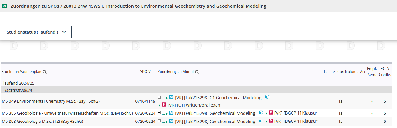 Die Veranstaltung 28013 wurde zwar nur einem Modul (Fak215298) zugeordnet. Da das Modul aber in drei laufenden Prüfungsordnungen vorkommt, werden mehrere Einträge angezeigt.