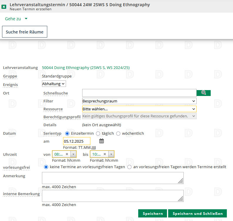 Darunter können Sie Anmerkungen, die für alle sichtbar sind, ergänzen oder interne Anmerkungen machen, die nur von Ihnen, den Lehrenden und der Raumvergabe gesehen werden können. Letzteres ist geeignet, um zusätzliche Informationen zu geben wie bspw. die Anzahl der mindestens benötigten Sitzplätze oder den Wunsch nach einer bestimmten technischen Ausstattung oder eines bestimmten Gebäudes.