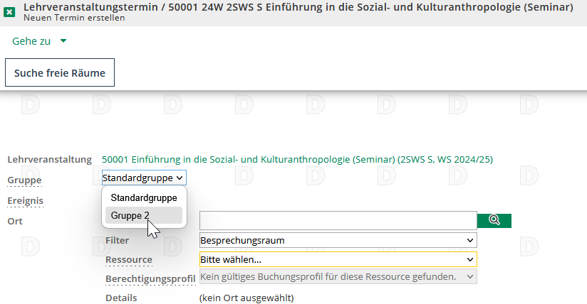 Wenn Sie mehrere Gruppen für eine LV haben, können Sie bei der Terminerstellung ganz oben auswählen, für welche Gruppen sie die Termine erstellen möchten.