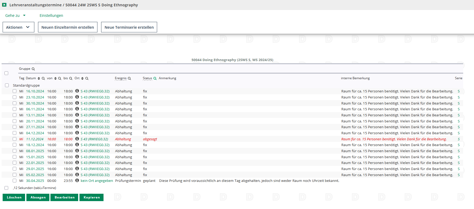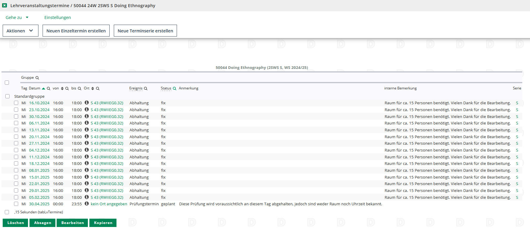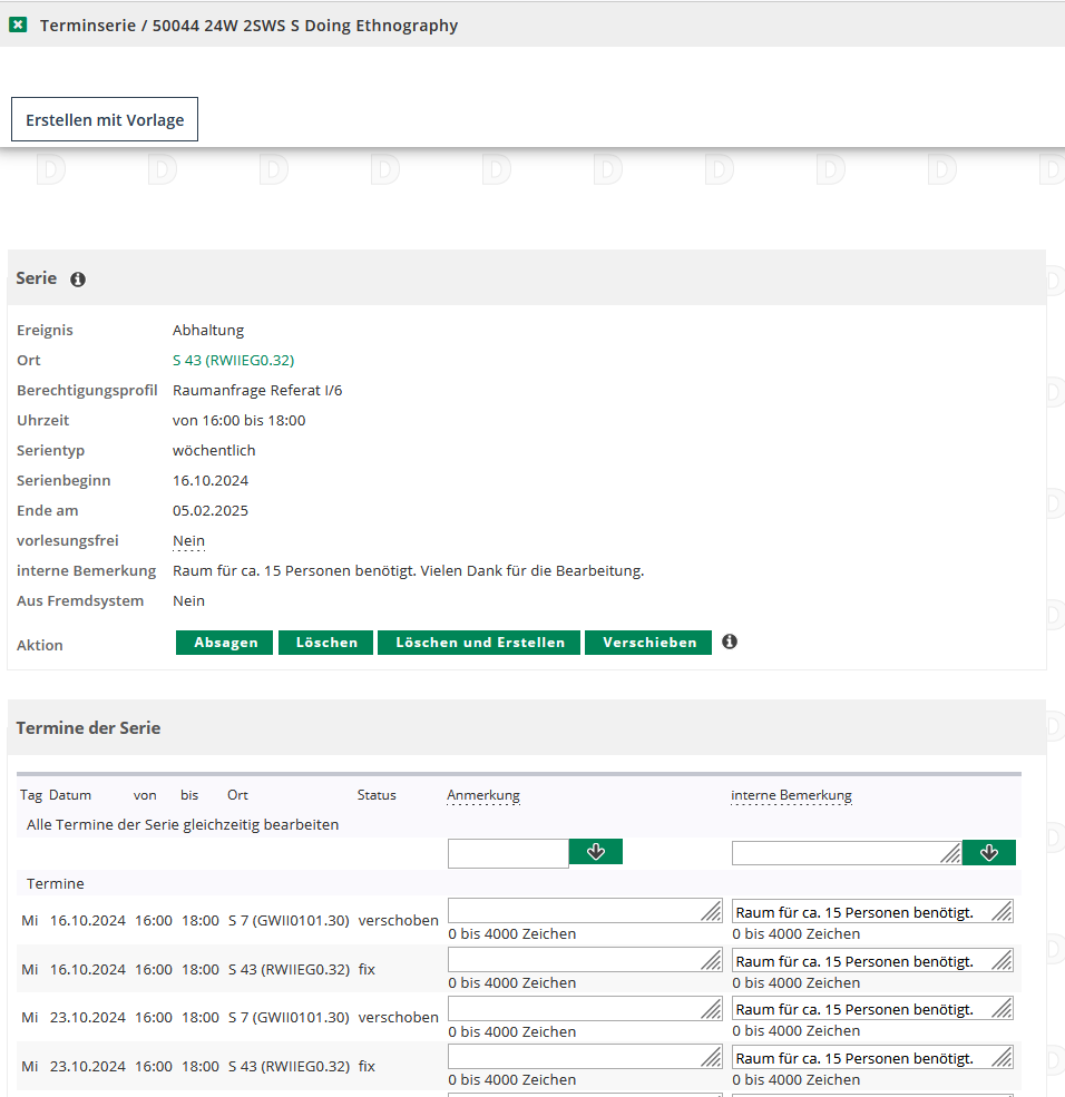 Es ist empfehlenswert grundsätzlich alle alten bzw. kopierten Terminserien zu prüfen. Da das Semester immer zu unterschiedlichen Zeiten beginnt, sich Seminarzeiten und Gruppengrößen ändern können, sollten Sie im Blick behalten, ob die nach dem Kopiervorgang hinterlegten Daten und Anmerkungen Ihren Anforderungen entsprechen. Im Zweifelsfall sollten Sie lieber die alte Terminserie löschen und eine neue erstellen, als händisch alle Einzeltermine anzupassen.