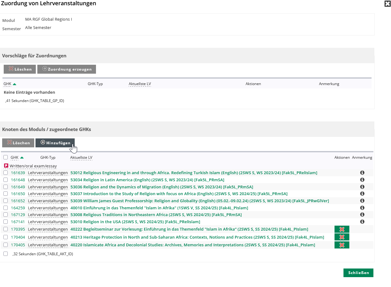 Die Entscheidung, ob eine LV mit einem Modul verknüpft werden kann, ist eine fachliche. Bei Fragen wenden Sie sich am besten direkt an die für das Modul verantwortliche Person.