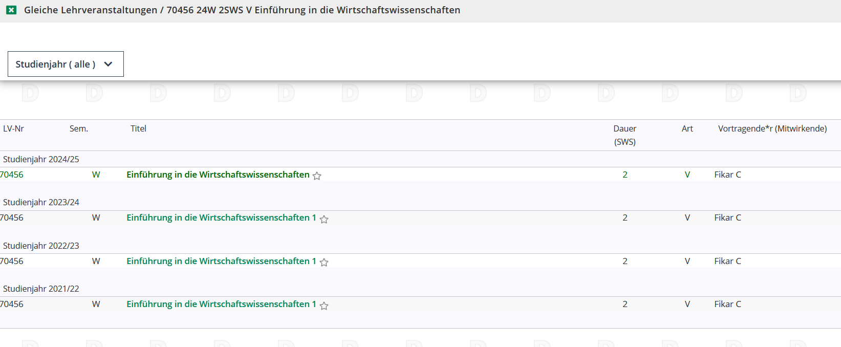 In der Menüführung oben lässt sich das Studienjahr auswählen, sowie eine andere Gruppierung der Liste der angezeigten LVs einstellen. Bei den meisten Spaltenüberschriften der Liste findet sich zudem ein Lupen-Icon, über das sich die Liste filtern lässt.