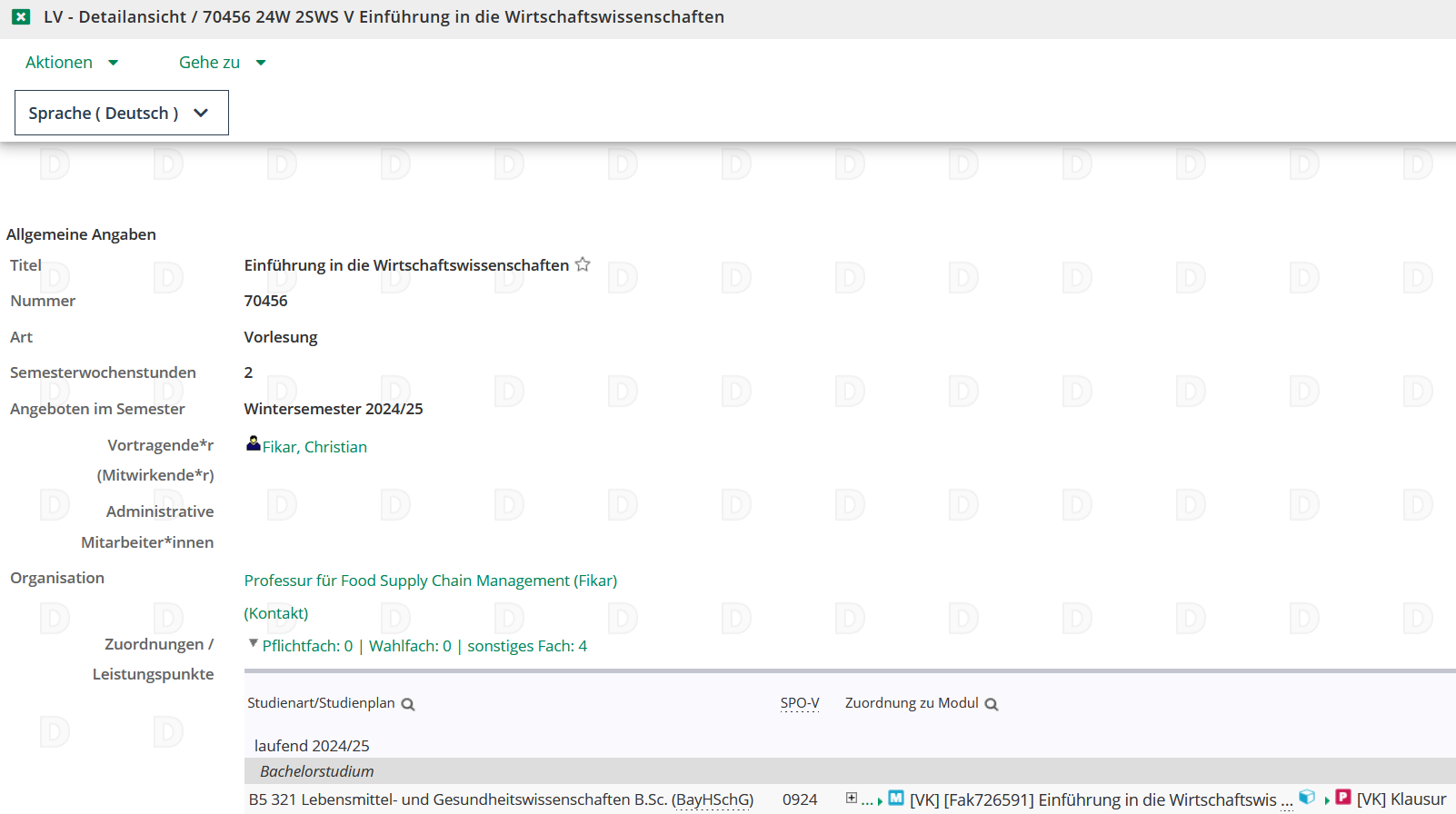 Im Abschnitt Zuordnungen/Leistungspunkte lässt sich nachvollziehen, über welche Module die LV in Studiengänge eingeht und wie viele Leistungspunkte mit welcher Prüfungsform damit verbunden sind.