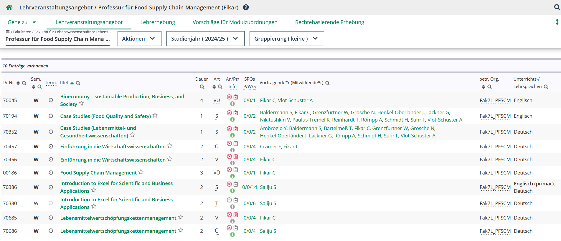 In der Applikation Lehrangebot werden die LVs der ausgewählten und aller untergeordneten OEs angezeigt. Beispielsweise werden im Lehrangebot einer Fakultät auch alle LVs der darunterliegenden Lehrstühle und Professuren angezeigt. Sie können mit dieser Applikation also alle LVs einer Professur, einer Fachgruppe, einer Fakultät und auch der gesamten Universität einsehen, je nachdem an welchem Punkt Sie die Applikation aufrufen.
