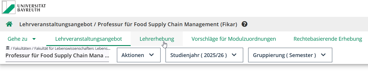 Um Änderungen am Lehrangebot einer OE vorzunehmen, müssen Sie die Ansicht erst vom Lehrangebot auf die Lehrerhebung wechseln. Dies können Sie entweder über Ihre Startseite und die Applikation Lehrerhebung oder indem Sie im Lehrangebot im Menü auf die Lehrerhebung wechseln.