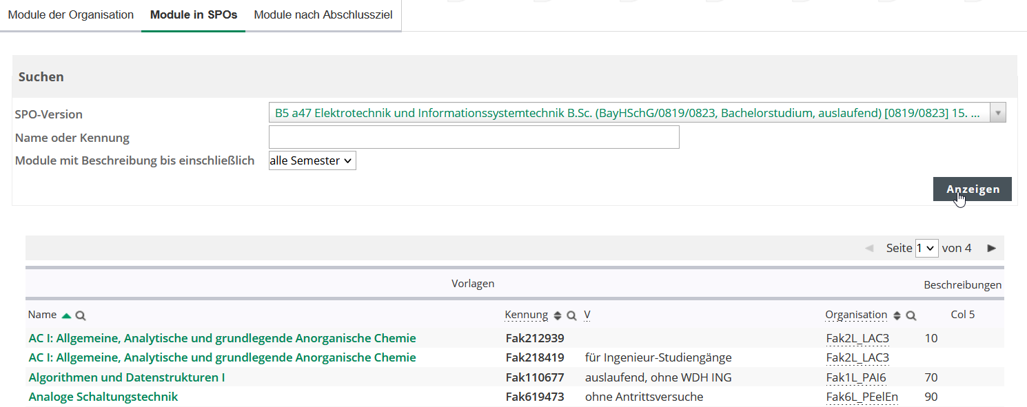 Wechseln Sie im Anschluss auf den Reiter „Module in SPOs“. Wählen Sie dann eine SPO-Version, setzen Sie den Filter Semester auf alle Semester und klicken Sie Anzeigen.
