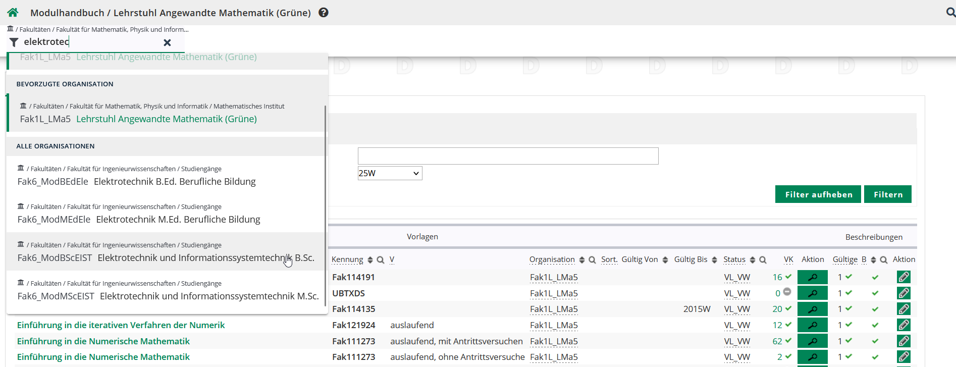 Um alle Module einer bestimmten SPO-Version als Liste anzuzeigen, können Sie im Modulhandbuch den entsprechenden Studiengang links oben im Organisationsfilter auswählen.