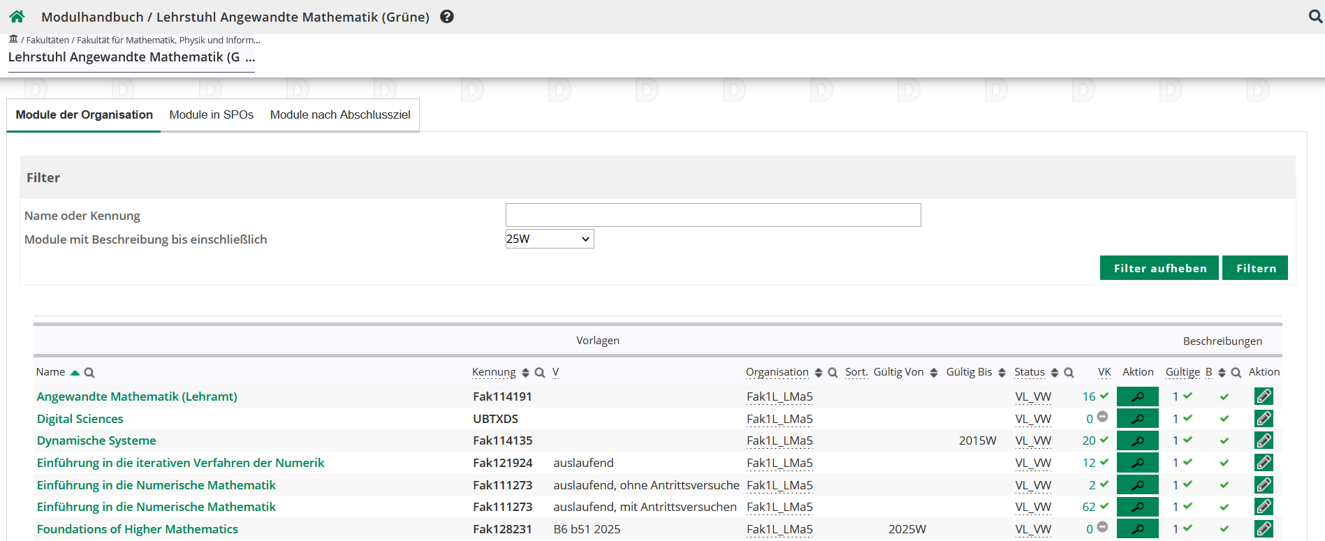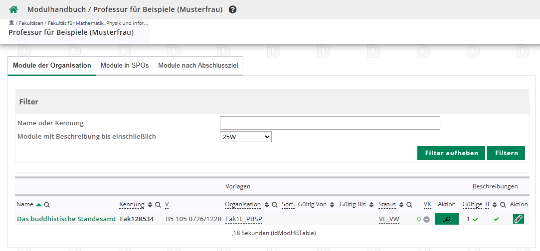 Frau Musterfrau findet ihre Module somit an der Organisation „Professur für Beispiele (Musterfrau)“, indem sie dort die Applikation „Modulhandbuch“ öffnet. Sie gelangt auf eine tabellarische Übersicht aller Module ihrer Organisation: