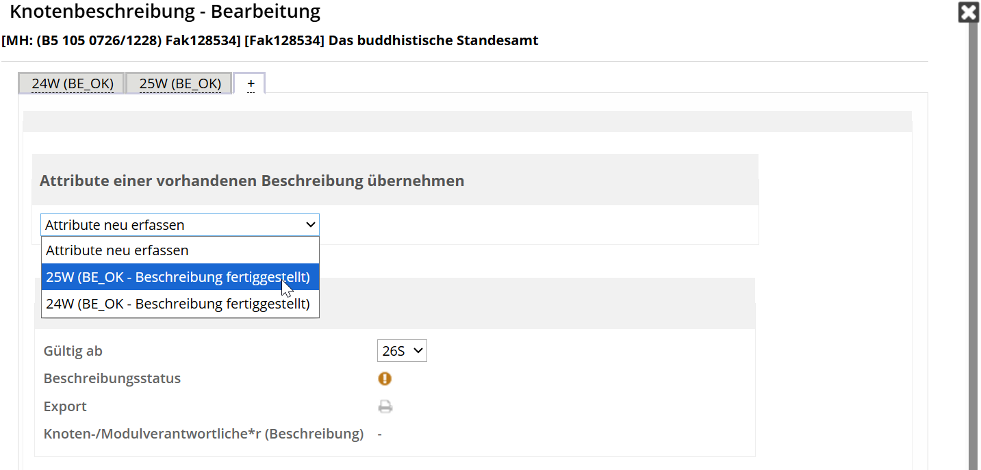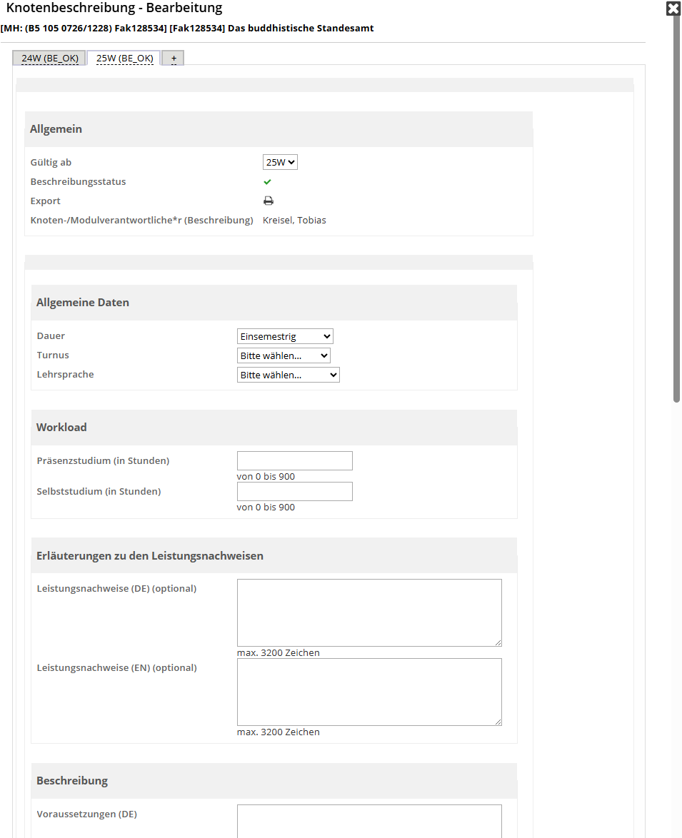 Die Beschreibung eines Moduls kann sich über die Semester hinweg ändern, daher kann in CO pro Semester eine Beschreibung hinterlegt werden; im Screenshot oben sind zwei Beschreibungen zu sehen, eine für das Wintersemester 2024/25 und eine für das Wintersemester 2025/26, dargestellt durch zwei Reiter/Tabs. Sofern bereits eine vollständige Beschreibung eines Moduls vorhanden ist und Anpassungen (z. B. an den Lerninhalten oder bei Art und Umfang der Lehrveranstaltungen) für zukünftige Semester vorgenommen werden sollen, müssen Sie über den Reiter mit dem Plus-Zeichen eine neue Version anlegen.