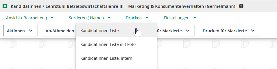 Wenn Sie die KandidatInnenliste nur für einen bestimmten Teil der Prüfungsteilnehmenden generieren möchten, so wählen Sie die betroffenen Teilnehmenden aus und gehen dann auf Aktion für Markierte.