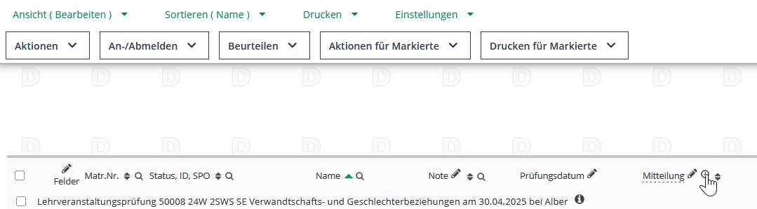 Für die Zuteilung nutzen Sie die Mitteilung an die Prüfungsteilnehmenden in der Teilnehmendenansicht (über die Spalte Kand.). Klicken Sie neben dem Spaltenkopf Mitteilung auf die Uhr.