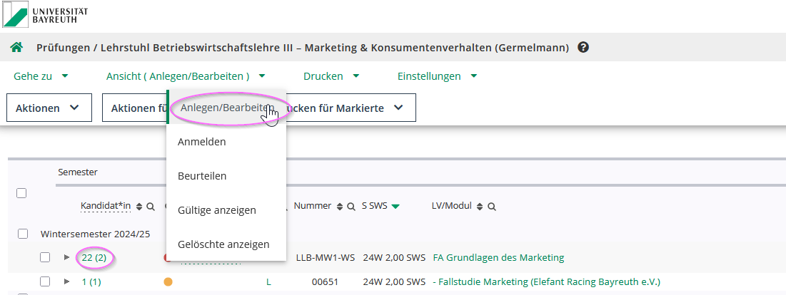 Über die Aktion Anmelden oder Beurteilen geben Sie für Ihre Prüfungsansicht eine Voreinstellung an, in der Sie danach über die Spalte Kand. die eingestellte Aktion durchführen können.