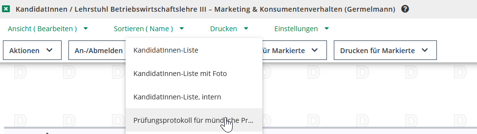 Für mündliche Prüfungen benötigen Sie ein Formular, auf dem Sie Einzelheiten zur Prüfung festhalten können. Dieses Formular können Sie für alle eingetragenen Kandidat*innen der Prüfung oder nur für einzelne ausdrucken. Die Auswahl des Formulars erfolgt analog zu dem der „KandidatInnenliste“.