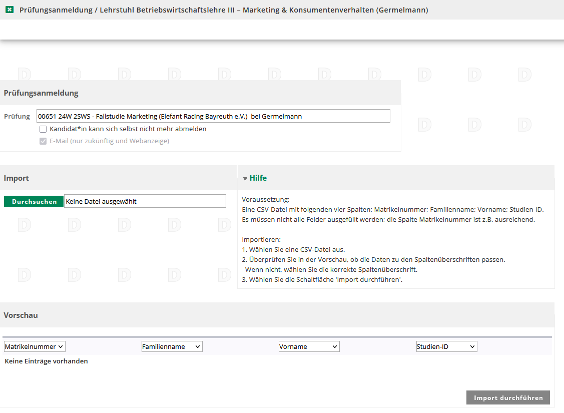 Die CSV-Datei muss mindestens die genannten Spalten Matrikelnummer, Familienname, Vorname und Studien-ID enthalten. Der einzelne Studierende wird über den Eintrag in der Spalte Matrikelnummer identifiziert. Wählen Sie die Datei mit Durchsuchen aus und laden Sie sie mit Import durchführen hoch.