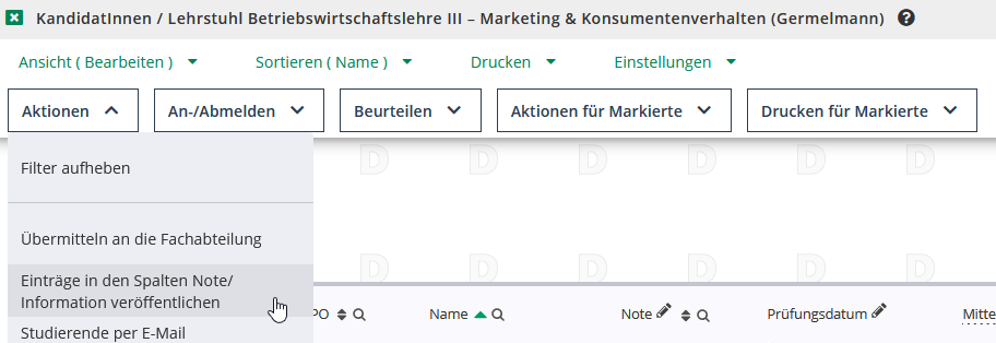 Navigieren Sie dann unter Aktion auf Einträge in den Spalten Note/Information veröffentlichen.